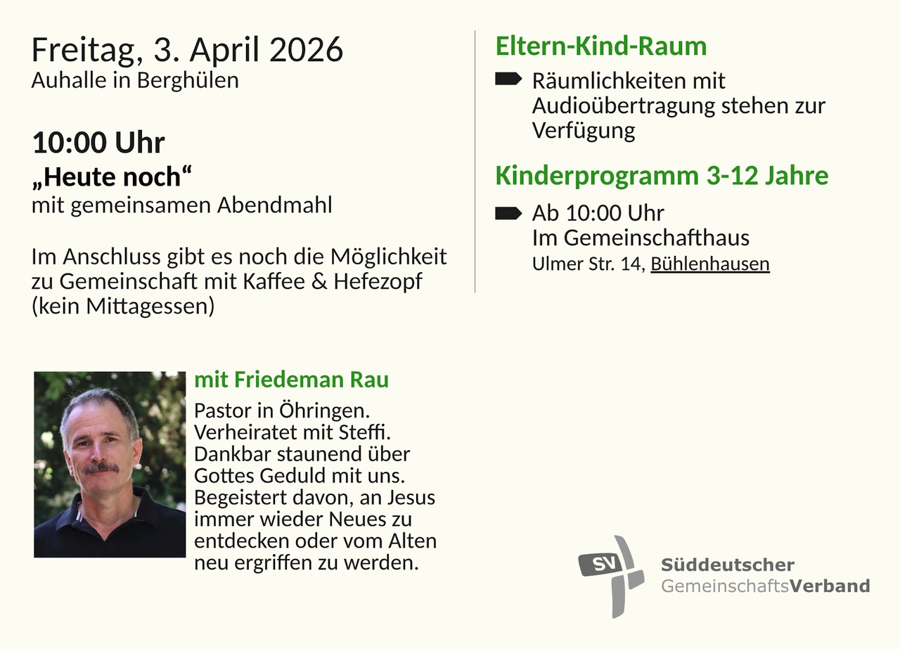 | 20:00 Uhr: Hauskreis Auszeit | 20:00 Uhr: Hauskreis Mack (14-tägig) |